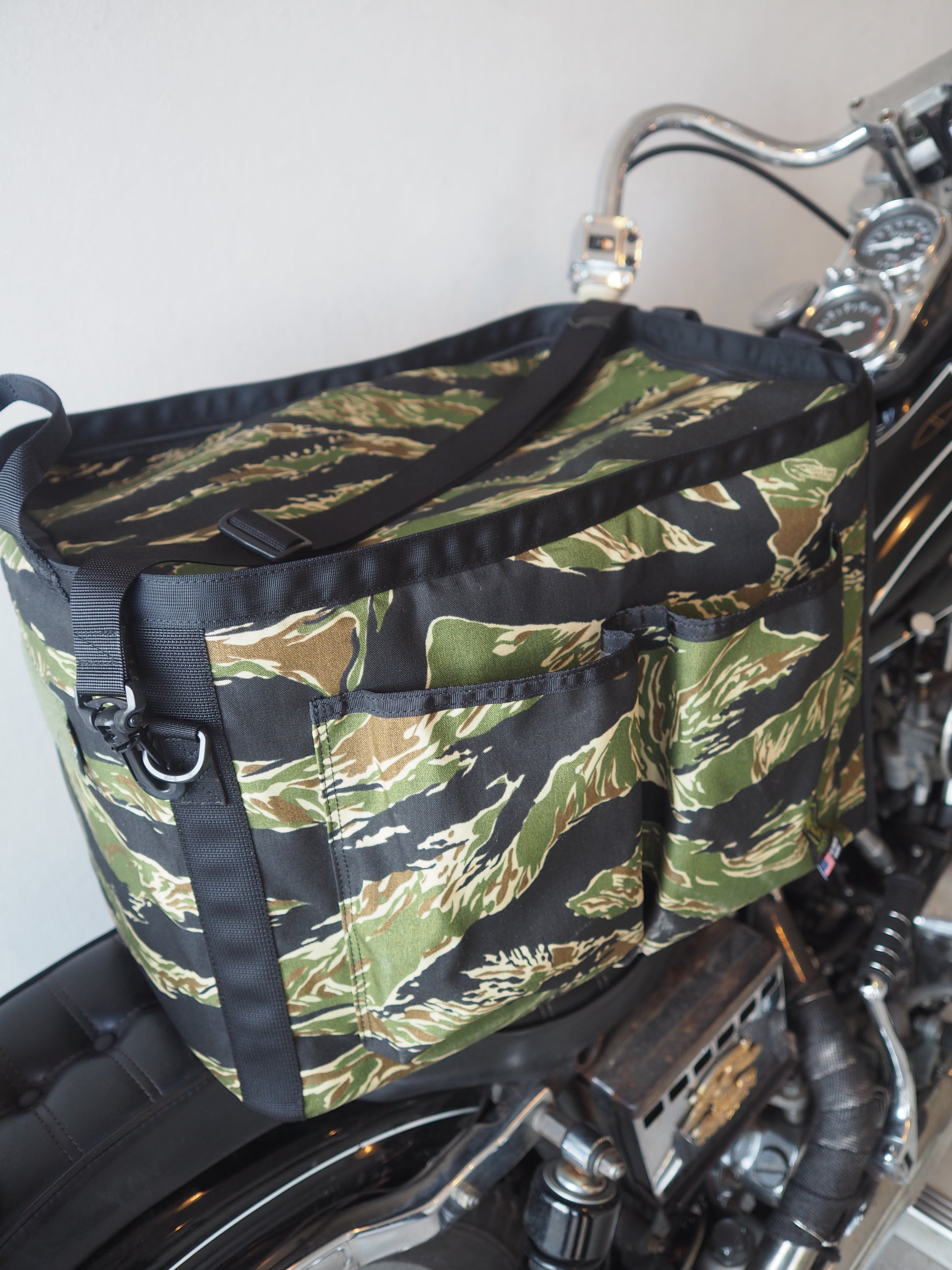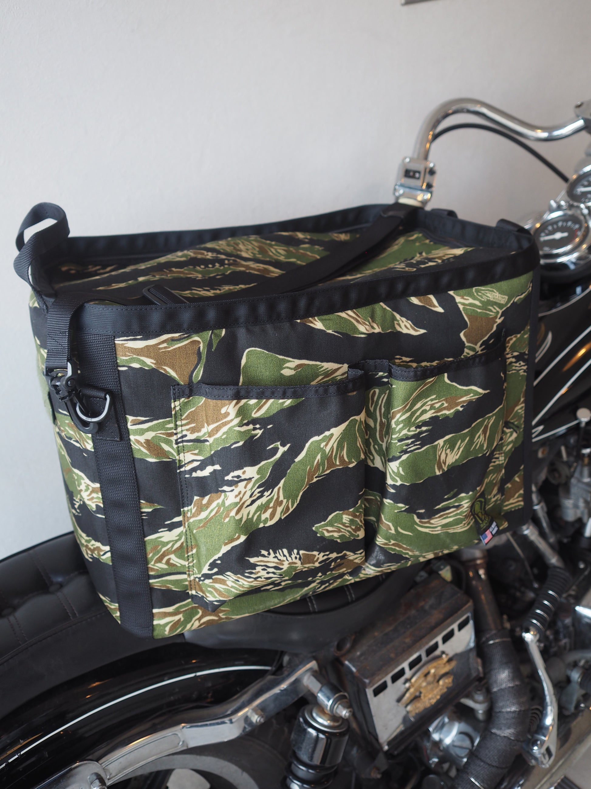長辺の片側には大型のアウトポケットを2つ、2面の短辺にはそれぞれIDポケットとお好みのワッペン等を付けられるベルクロベースを配置いたしました。